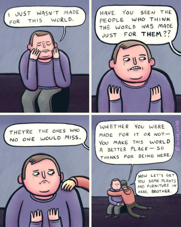Vredna si ljubezni, bližine, skrbi in vsega lepega. Tega si ti ni treba posebej prislužiti, to ti pripada kot živemu bitju. Nič slabša nisi od drugih in drugi niso nič boljši od tebe. Zadnjič sem zasledila tale strip in se mi zdi, da je kot nalašč za najin pogovor: